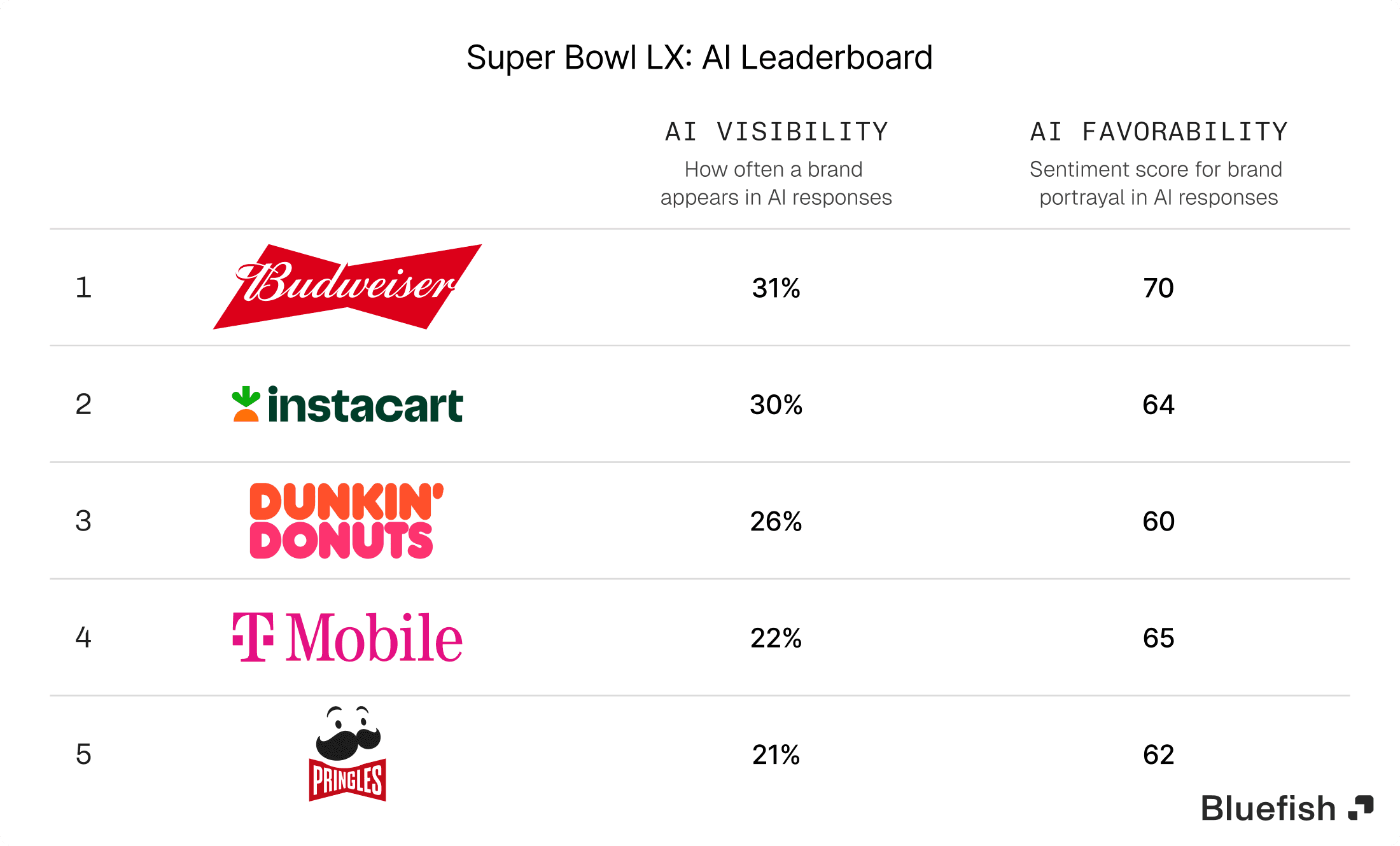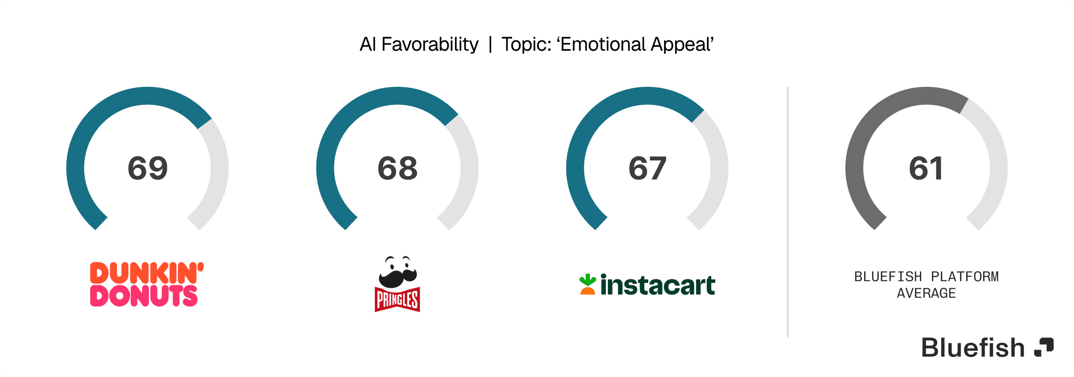 Bluefish found that authenticity and relatability were the most important topics that LLMs considered when evaluating Super Bowl ads. Three of the top five most visible brands (Dunkin’ Donuts, Pringle and Instacart) scored above the industry average (61) in favorability for emotional appeal, with scores of 69, 68, and 67 respectively. All three ads leaned on humor and celebrity, which played a role in the “emotional appeal” scoring.