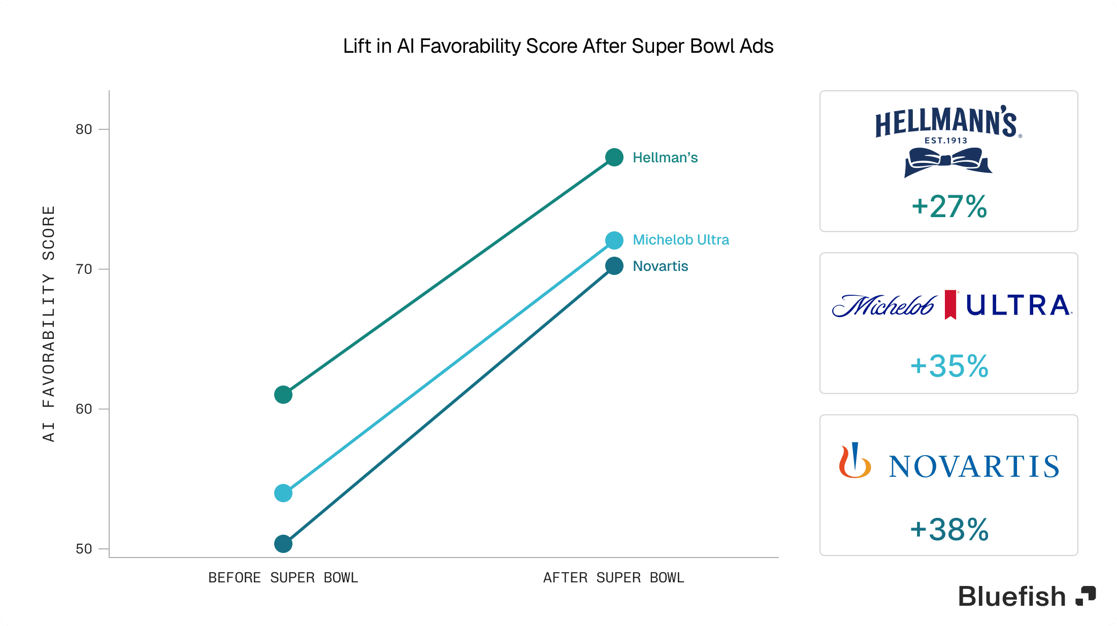 Bluefish found Hellmann's, Michelob Ultra and Novartis saw the biggest lift in AI Favorability as a result of running ads in the Super Bowl