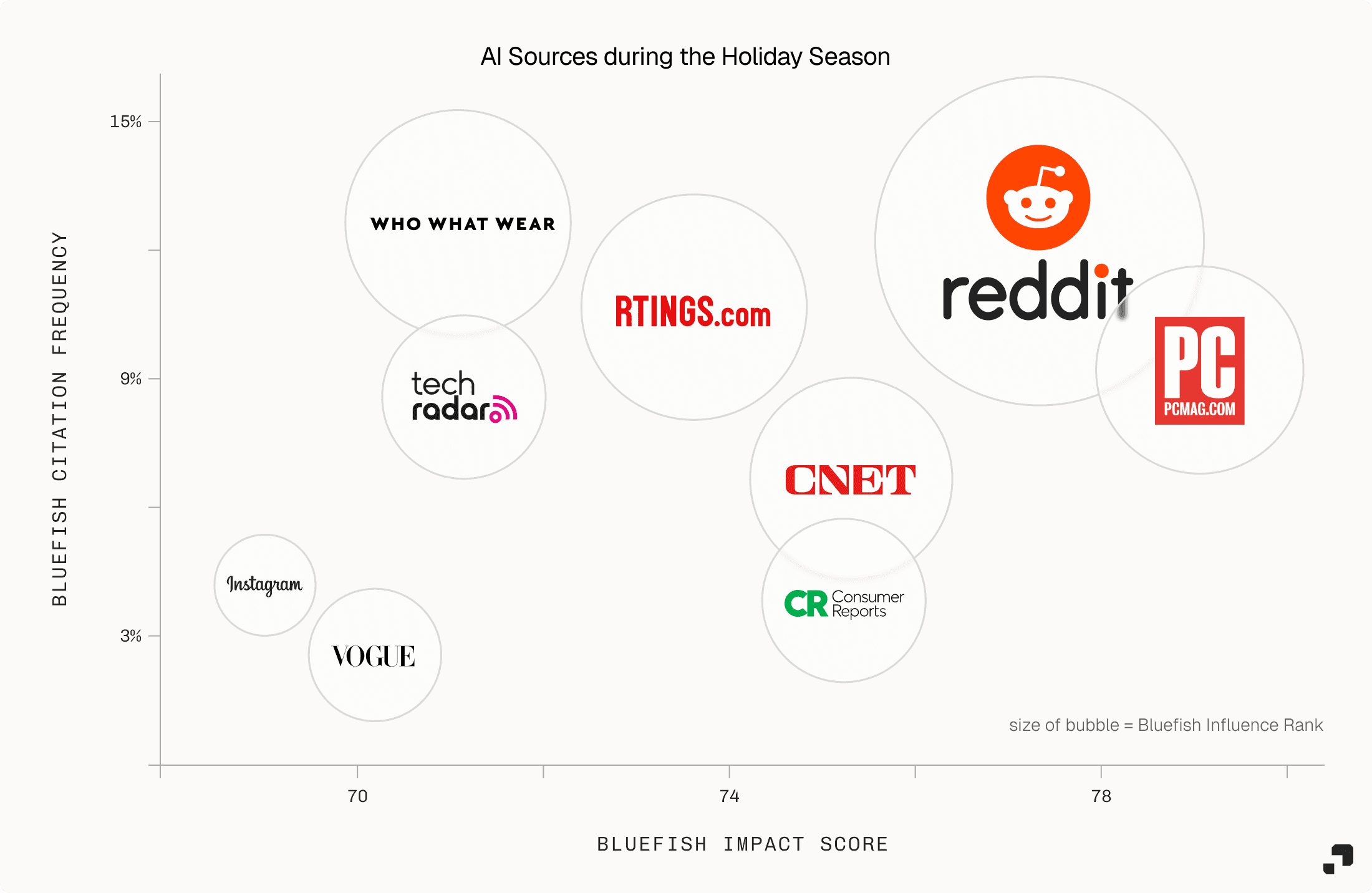 Bluefish’s Impact Score and Influence Rank metrics, originally introduced in the Black Friday report, reveal that a relatively small set of high-signal pages drove a disproportionate share of AI holiday recommendations. In multiple categories, a handful of authoritative gift guides and review roundups shaped how AI defined “best gifts” and “best deals under 100 dollars,” effectively functioning as the new upstream media placements for AI commerce.
