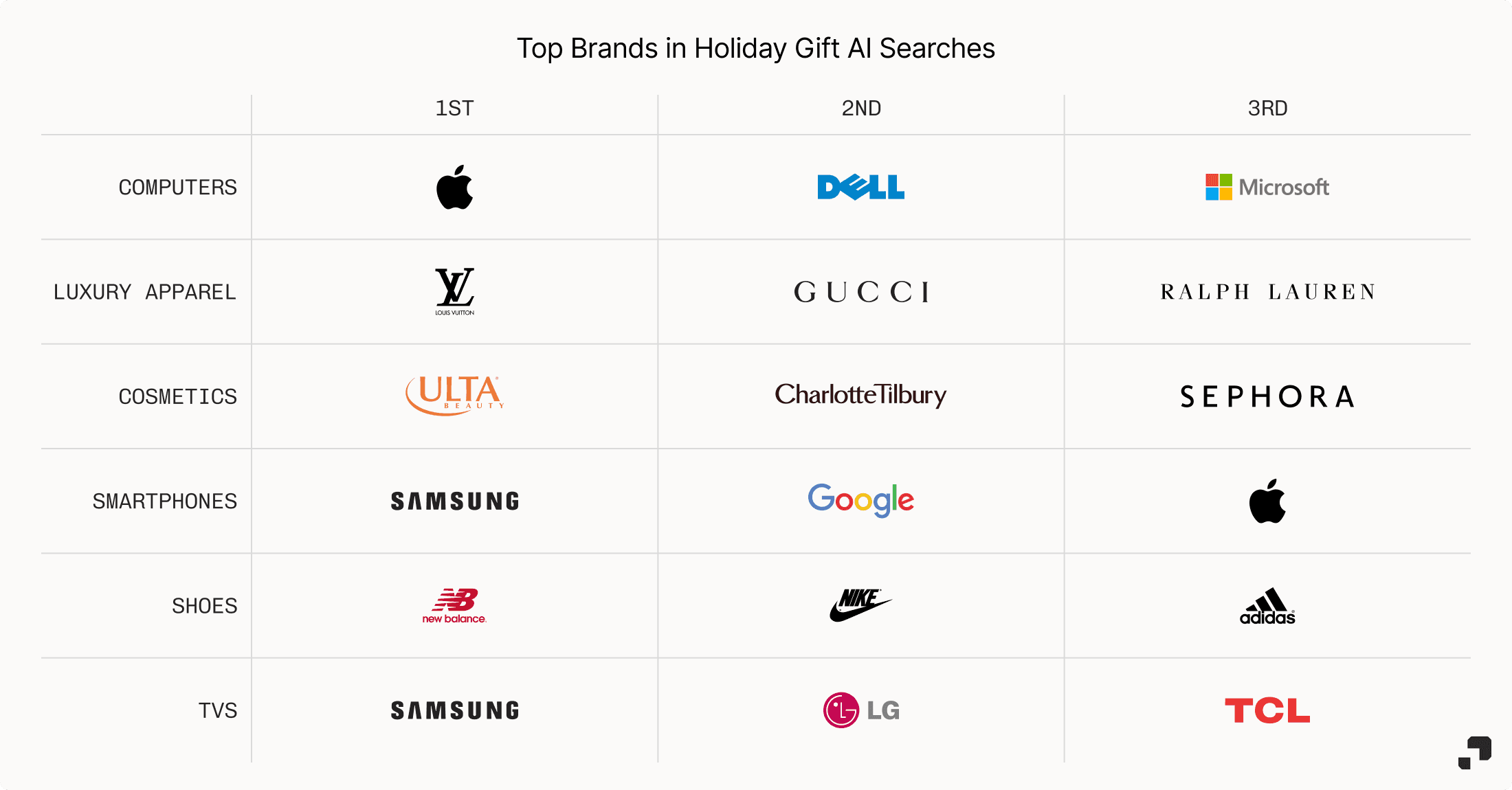 In luxury, brands such as Louis Vuitton, Gucci and Ralph Lauren achieved significant visibility as AI emphasized gifting as an expression of taste and status rather than pure savings. These brands benefited from decades of accumulated cultural relevance, but their holiday performance was also supported by a dense fabric of curated gift guides, editorial lists, and high-intent reviews that positioned them as definitive answers for “best luxury gifts.”